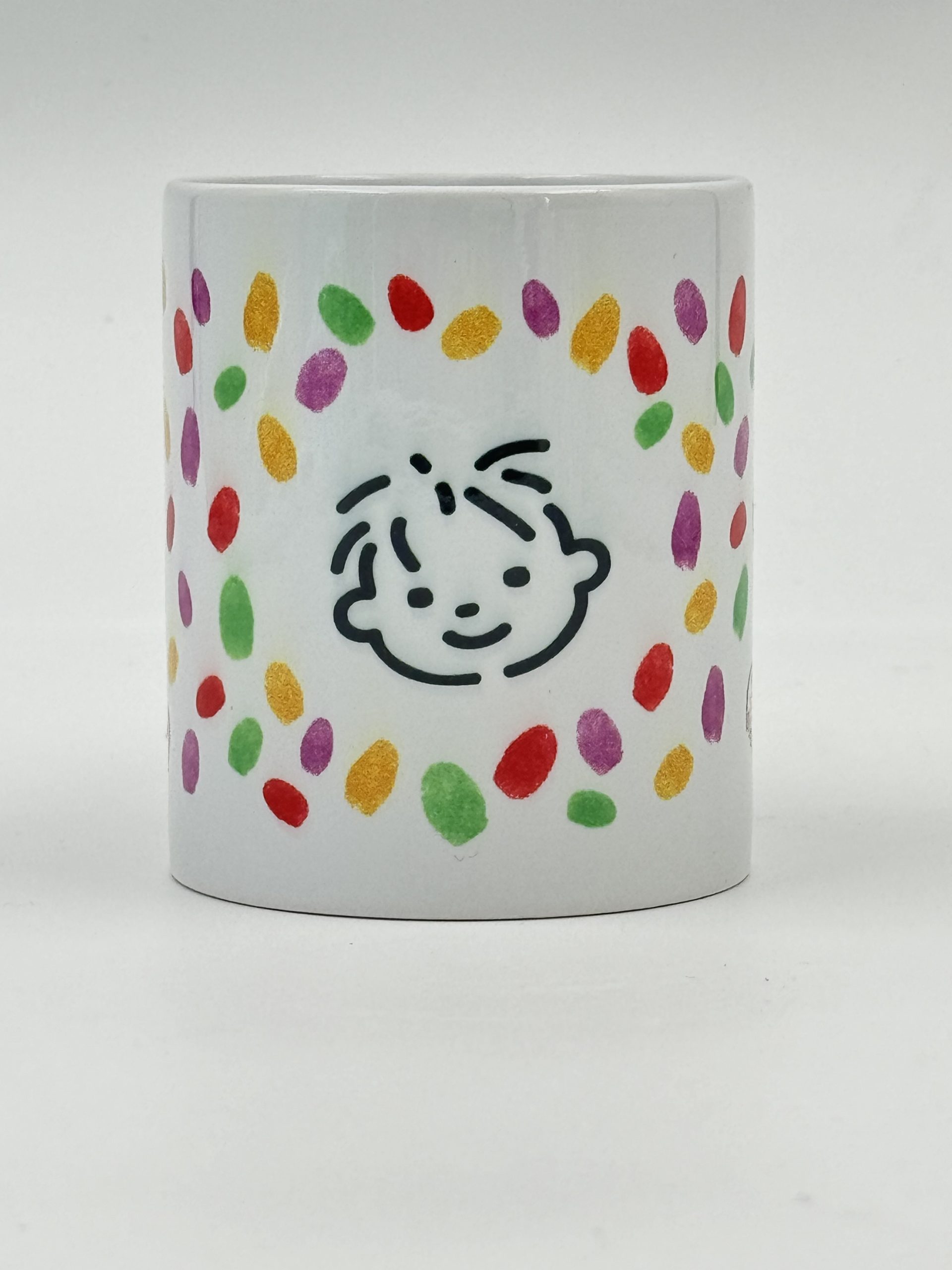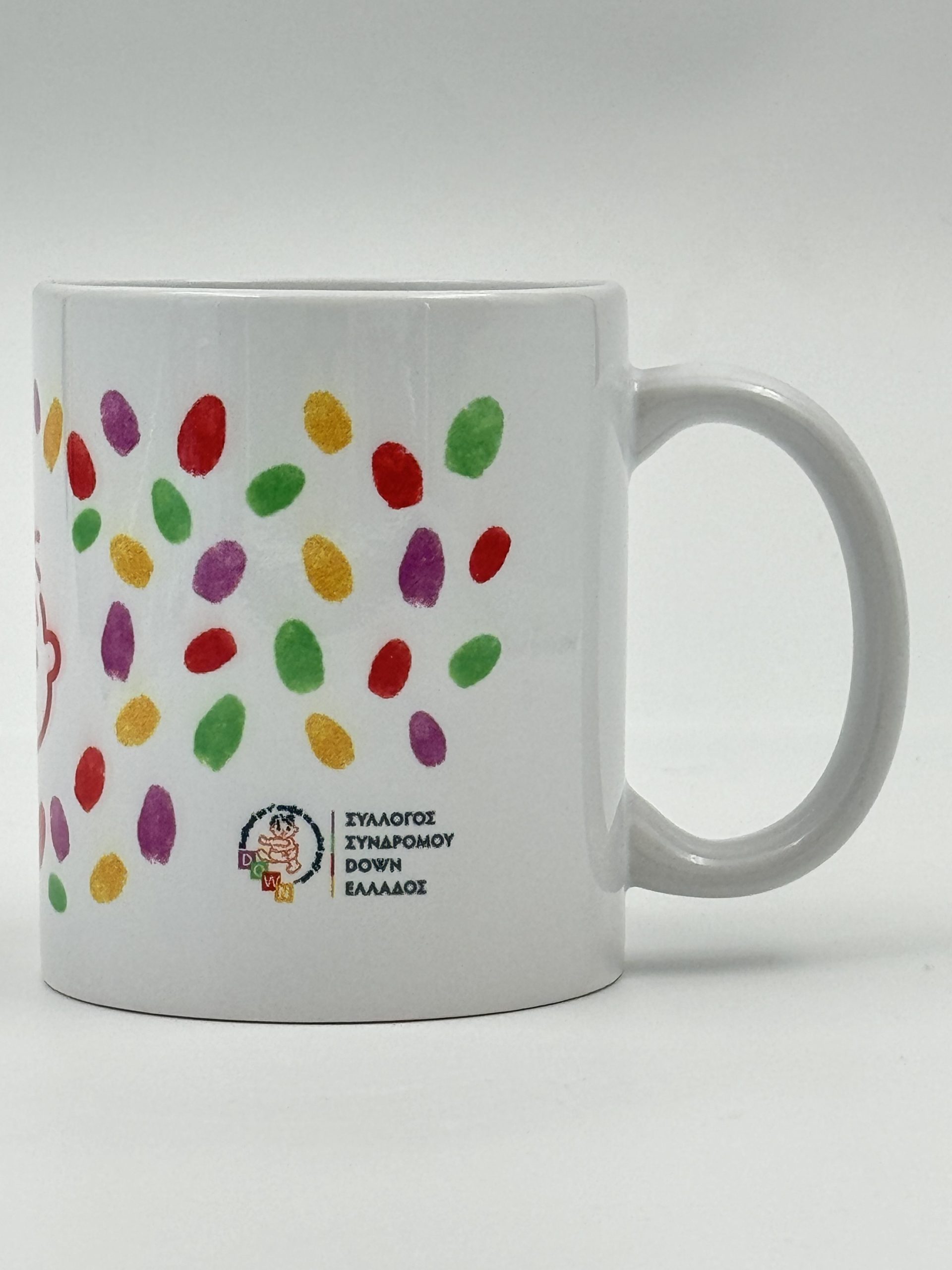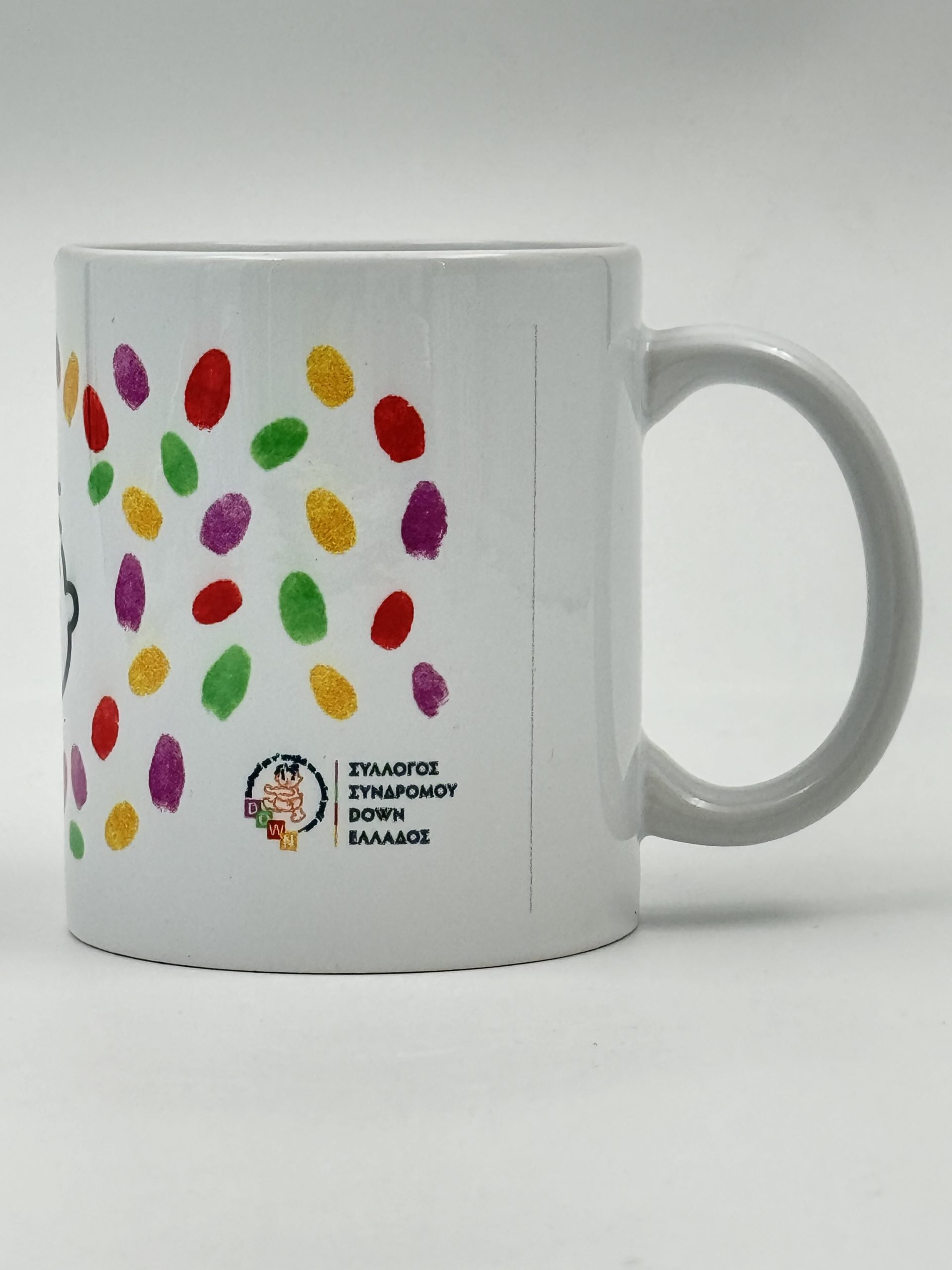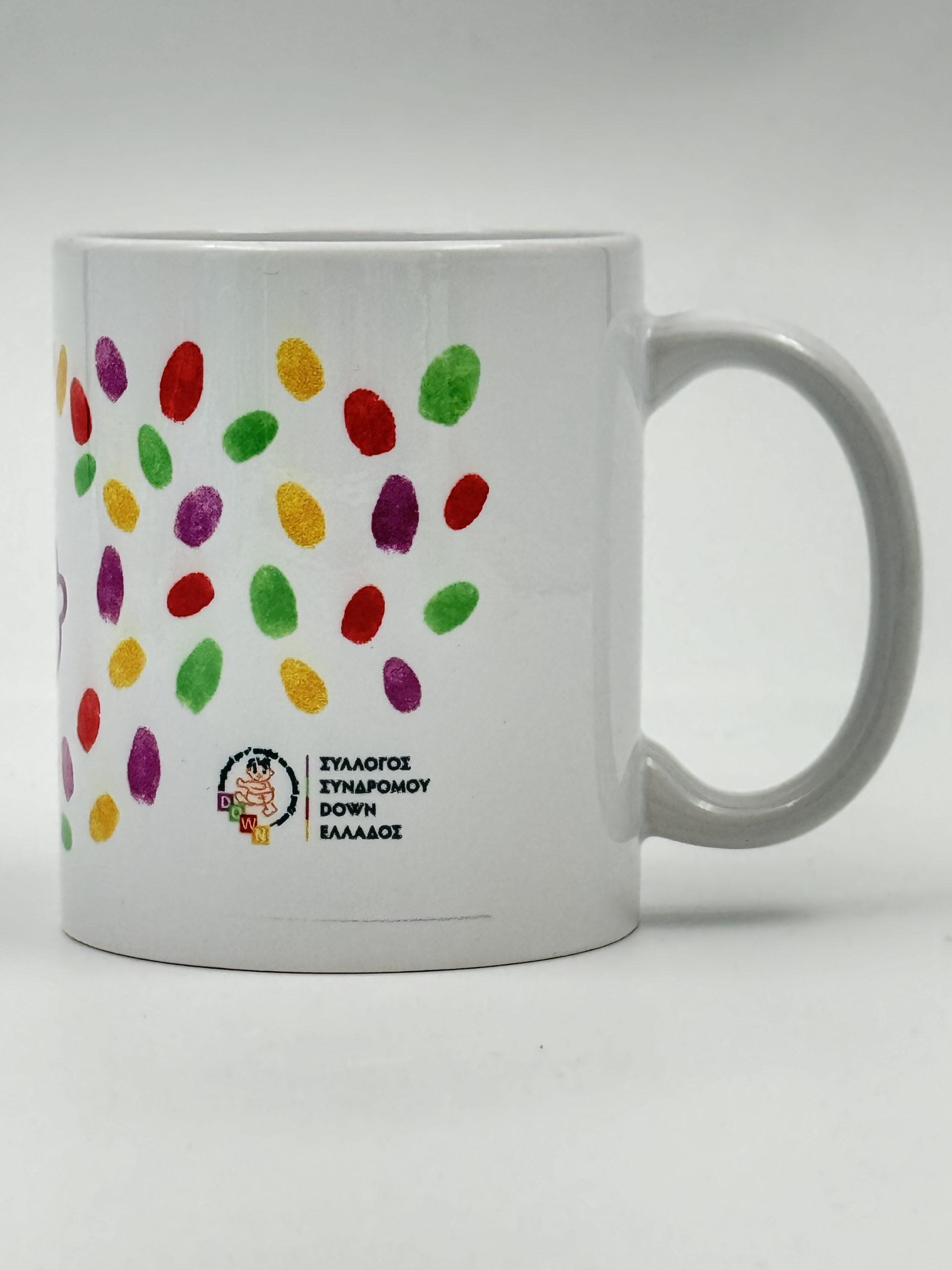 Κεραμική κούπα με το λογότυπο του Συλλόγου και δαχτυλικά αποτυπώματα των ωφελουμένων μας σε διάφορα χρώματα.