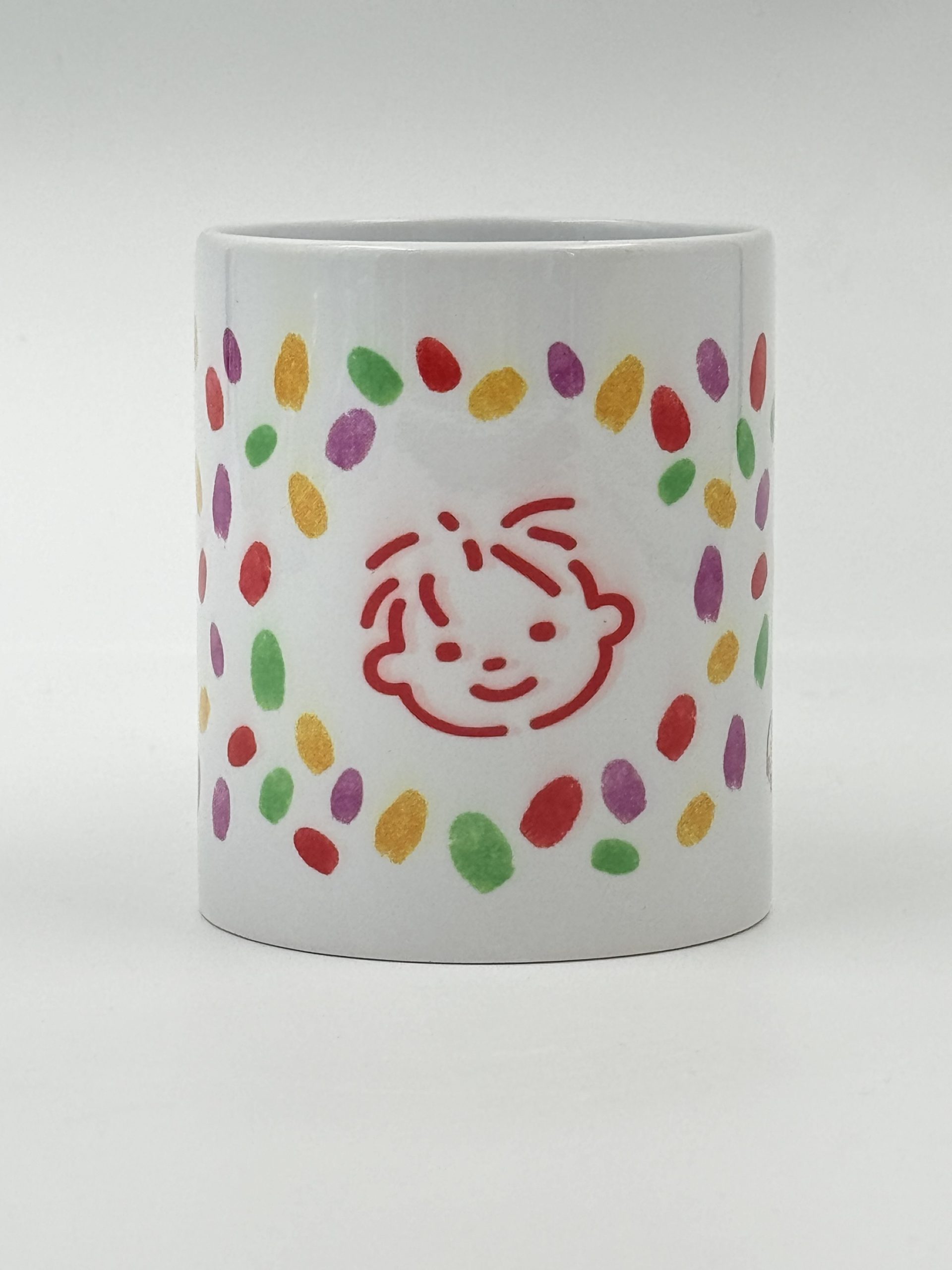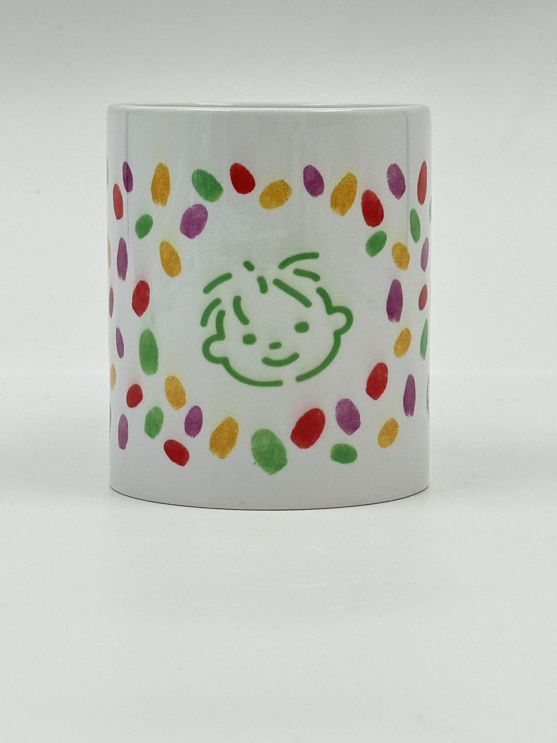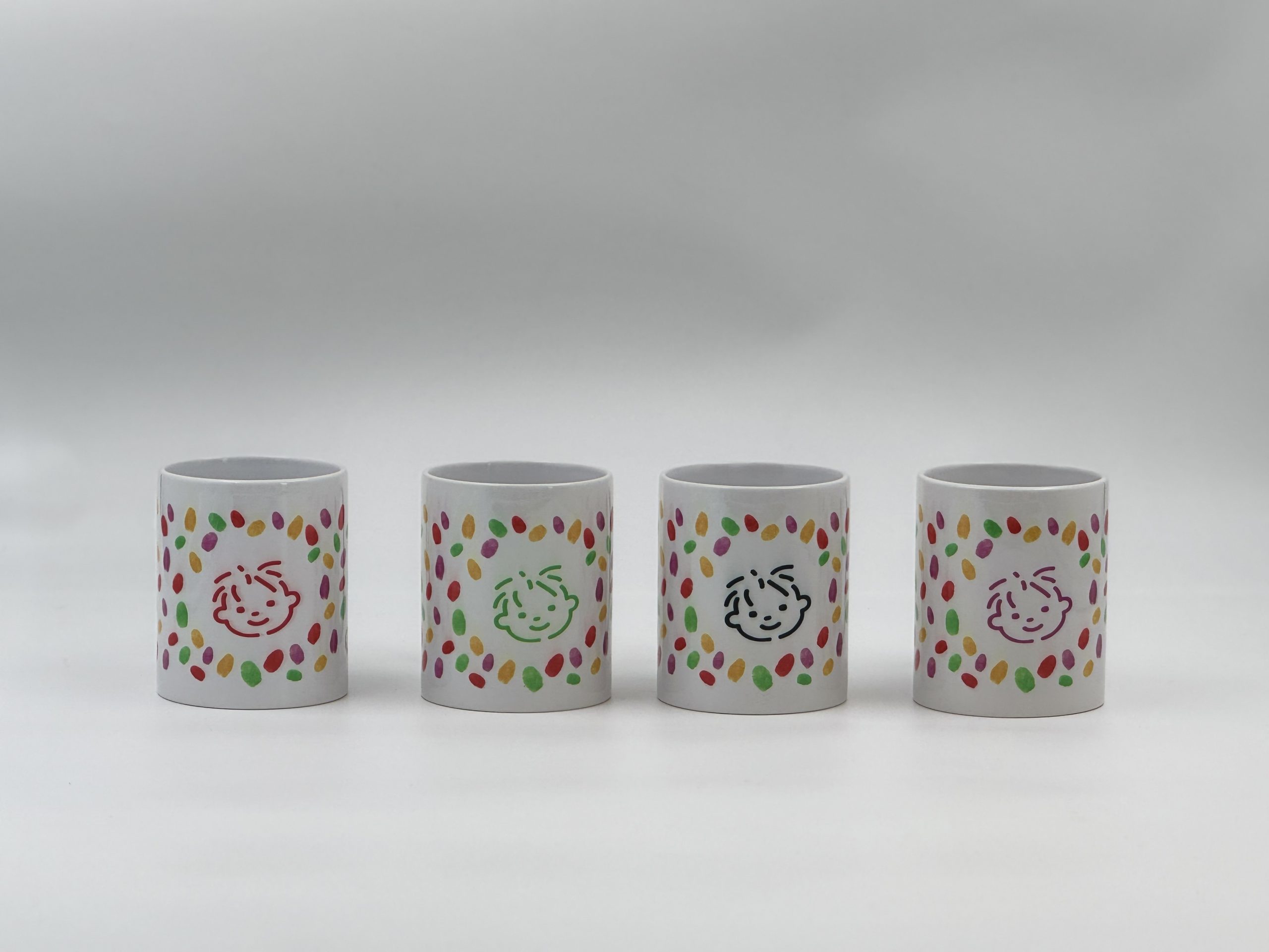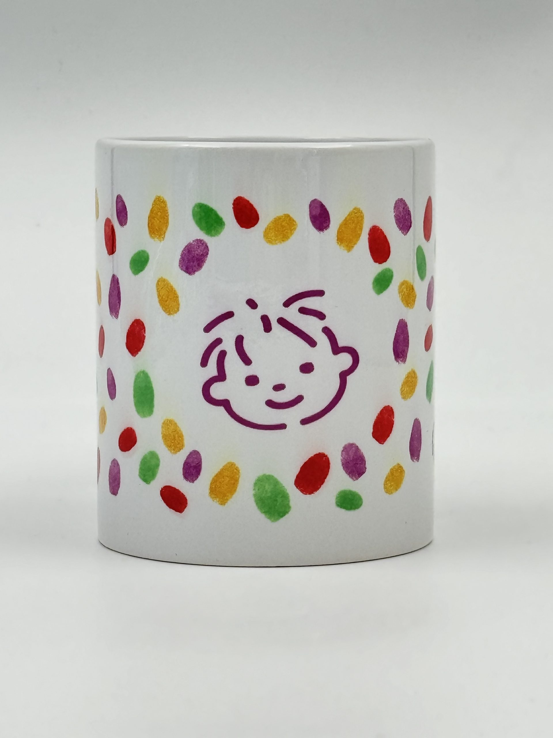Κεραμική κούπα με το λογότυπο του Συλλόγου και δαχτυλικά αποτυπώματα των ωφελουμένων μας σε διάφορα χρώματα.